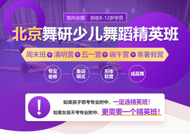 精英班开设中国舞、古典、芭蕾、 软度、技巧、舞蹈组合、成品剧目等全面课程,让孩子在每个假期持续性学习训练 !