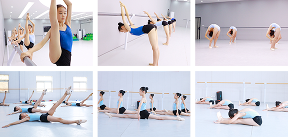 训练孩子们从颈、肩、臂、胸、腰一直到胯、膝、踝、趾各部关节韧带的软度、开度、规范性