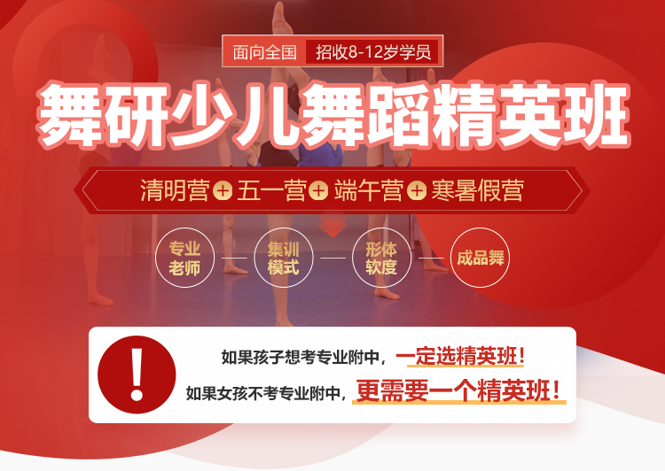 精英班开设中国舞、古典、芭蕾、 软度、技巧、舞蹈组合、成品剧目等全面课程,让孩子在每个假期持续性学习训练 !